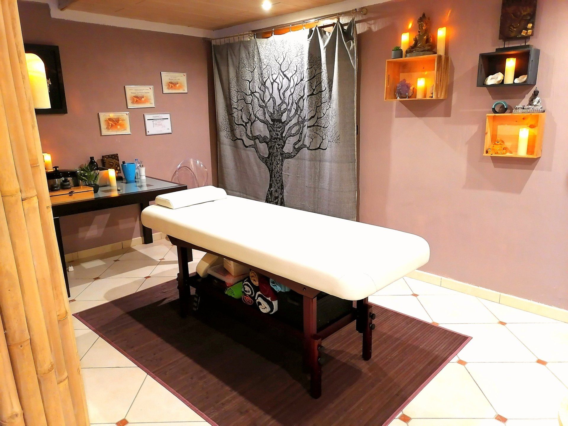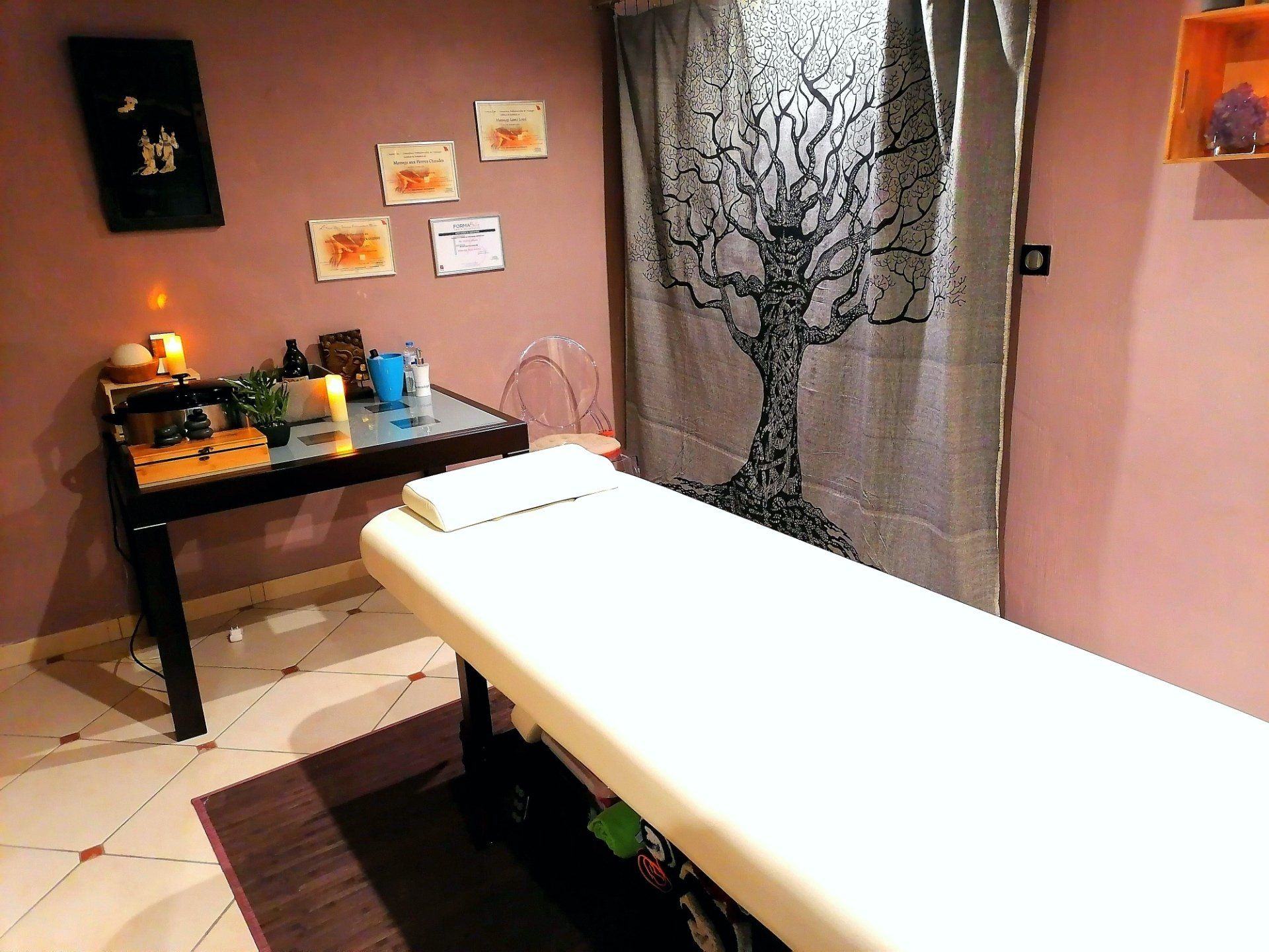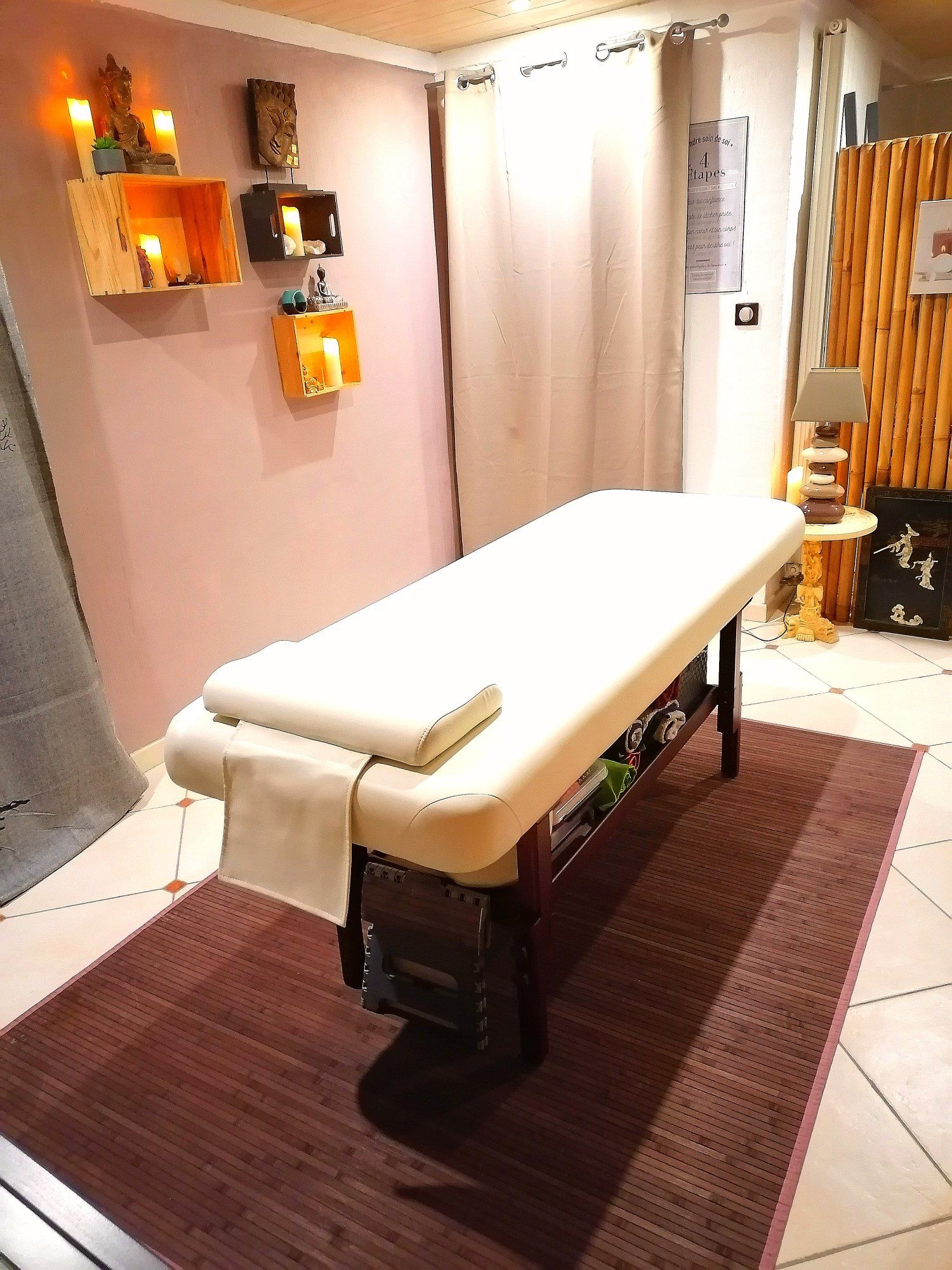 Le massage se déroule sur une table de massage dans un espace relaxant.